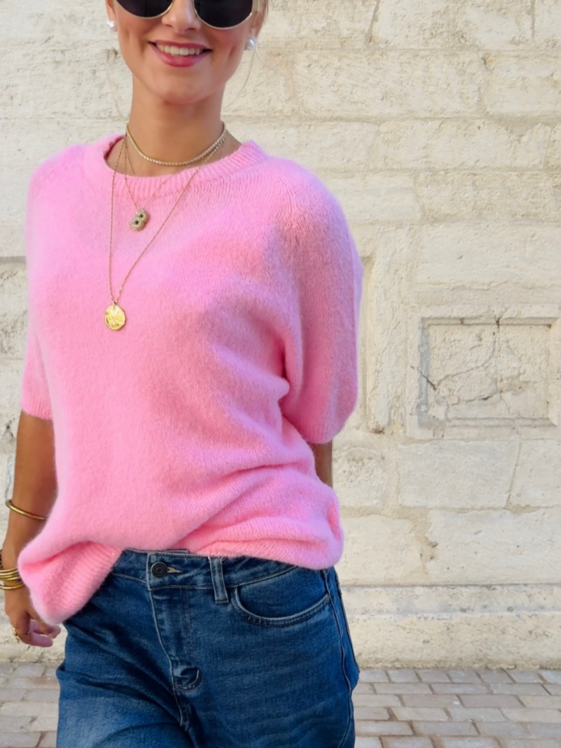 - Pull à manches courtes en maille duveteuse, parfait pour la mi-saison.